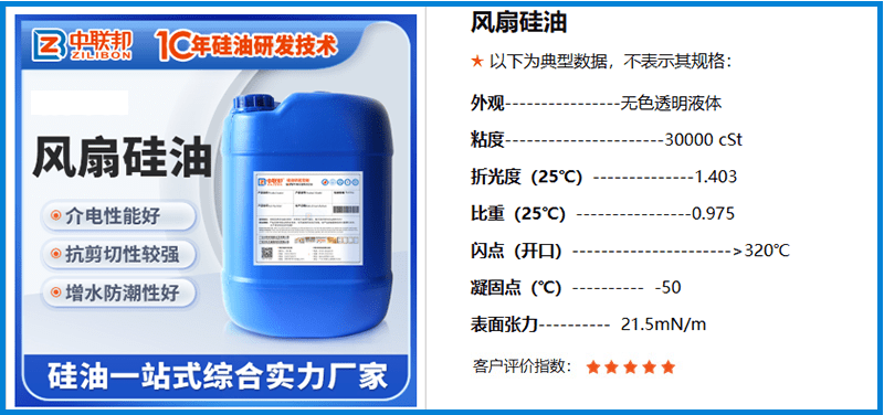风扇硅油是一种透明液体、无毒、无腐蚀,具有生理惰性。同时还具有优良的耐冻、耐热、耐氧化性,可在-50℃~200℃温度范围内长期使用。粘温系数小,介电性能好,具有很好的电绝缘性能。另外,还具有较强的抗剪切性及良好的透光性、表面张力低,增水防潮性好,挥发性小等特性。
